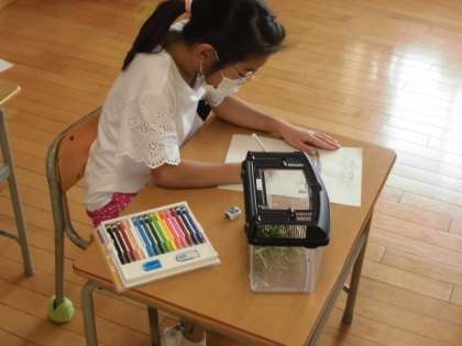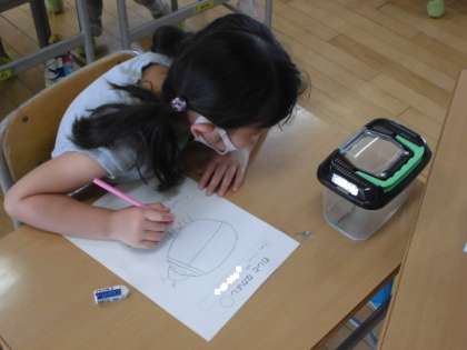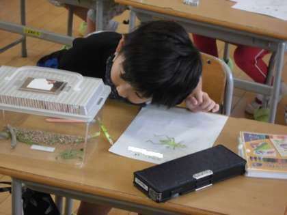 「目が横に付いているよ!」「足がギザギザになっているよ」と虫の様子をよく見ていました。
