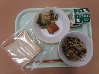 食パン(減) 牛乳 ベーコンとひじきのわふうスパゲッティ てりやきチキン ビーンズサラダ