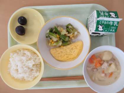 ごはん 牛乳 オムレツ アスパラサラダ しろいんげんまめのシチュー