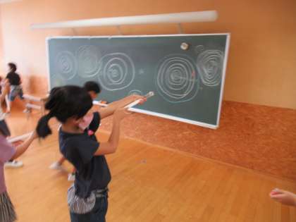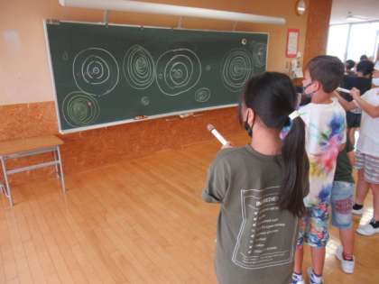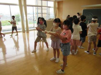 とじこめた空気の学習では、空気鉄砲を使って的当てを行いました。どうすれば強い玉を飛ばすことができるのか考えたり、玉が出る仕組みについて話し合う場面が見られました。