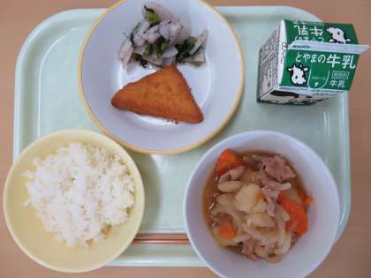 ごはん 牛乳 にくじゃが はんぺんフライ ゆかりあえ