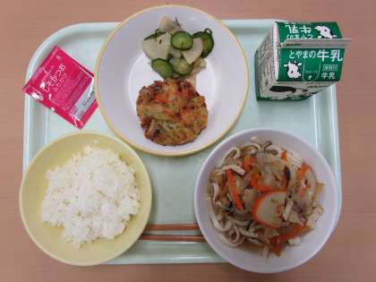 ごはん 牛乳 かしわうどん えごまいりかきあげ こんぶあえ しそかつおふりかけ