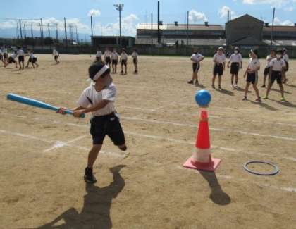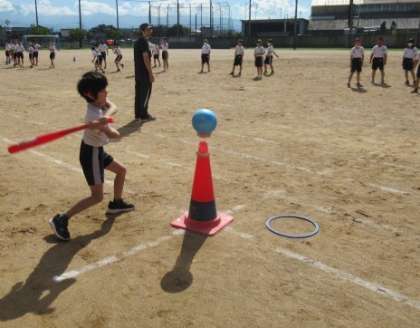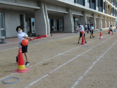 ティーボールの学習ではバッティングの練習を行いました。バットの振り方やボールを当てる場所、ボールのどこを打つかなど、どうすればボールを力強く打てる方法かを考えたり、友達同士で教え合ったりする様子が見られました。