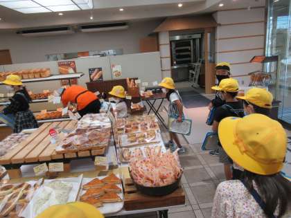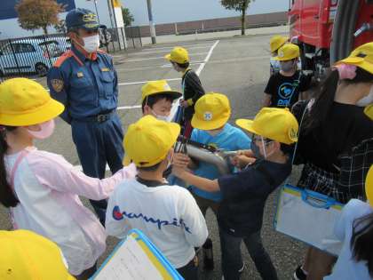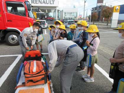 青コースは、やかもち藏と消防署に行きました。おいしそうなお菓子やパン、消防車と救急車の設備等ををたくさん見ることができて、とても満足げな子供たちでした。