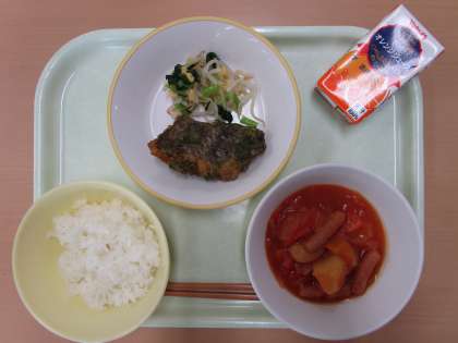 ごはん さかなのフリッター コーンあえ まめとソーセージのトマトに オレンジジュース