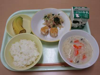ごはん 牛乳 にんじんシューマイ きりぼしだいこんのペペロンチーノ とうにゅうみそスープ バナナ