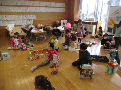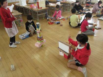 算数科の学習では、形の学習をしています。空き箱や空き缶を使って、タワーや車等、いろいろなものをつくりました。この箱はどう使おうかな?と考えながら、箱を重ねたり、組み合わせて並べたりすることを楽しんでいました。