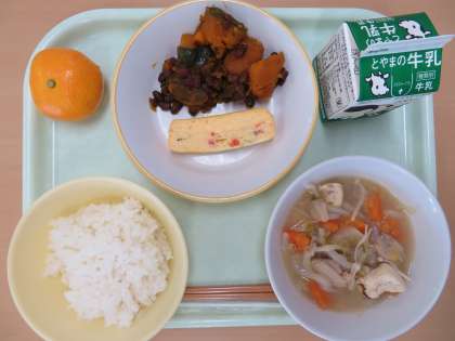 ごはん 牛乳 はくさいなべ ちぐさやき かぼちゃのいとこに みかん