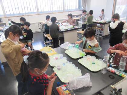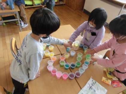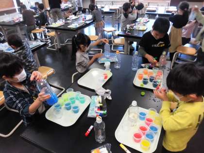 図画工作科の学習で、絵の具を使ってカラフルな色水をつくりました。様々な色の組み合わせを試しながら「きれいな色になったよ!」とお気に入りの色を見付けていました。