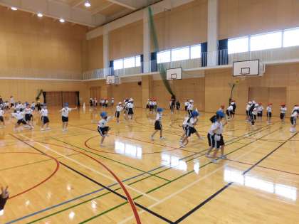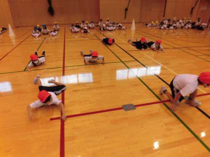 体育科の学習では、表現遊びに取り組んでいます。カニやワニ、うさぎやくま等になりきり、体を大きく使いながら表現を楽しんでいました。