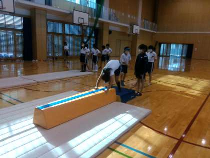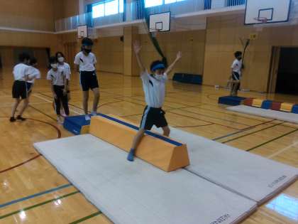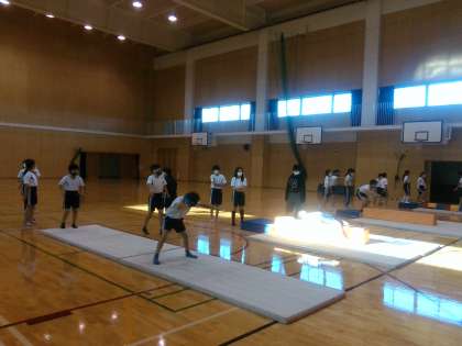 体育ではマット運動をしています。今日は開脚前転の練習をしました。自分のレベルに合わせて場を選びながら、しっかり足を開いて立ち上がることができるよう、練習しました。