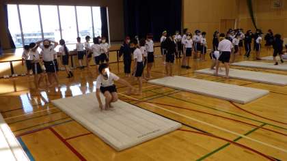体育の学習ではマット運動が始まりました。前転や後転などの基本的な技だけでなく、発展的な技まで練習をしていきます。