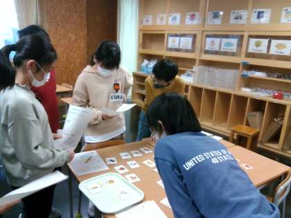 外国語の授業で、ビュッフェ体験をしました。ていねいな尋ね方や答え方をして、お客さんの注文をとったり、友達の選んだメニューを注文したりしました。