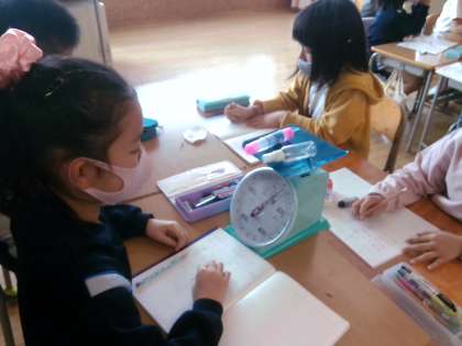 今日の算数科の学習では、はかりを使って色々な物の重さを量りました。1目盛りが、いくつかを考え、針の指す目盛りの重さを班のみんなで確認しました。