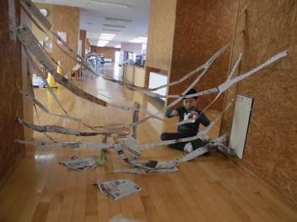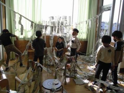 図画工作科で、細長い紙をつないだりつるしたりしながら、思いついたことを工夫してつくりました。「蜘蛛の巣みたい」「レーザー光線みたいだ」とおもしろい形を見付けながらどんどんつなぎ、楽しみました。