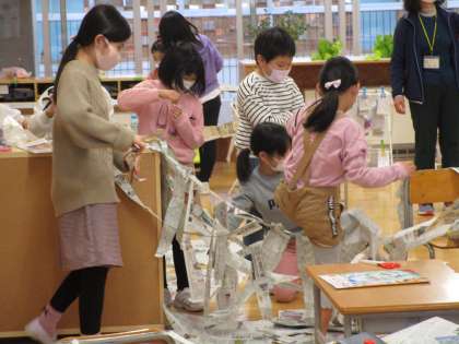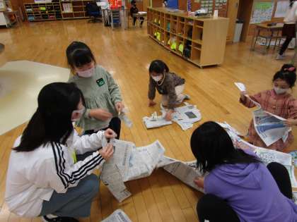 細長くちぎった新聞紙をつないだりつるしたりして、活動しました。