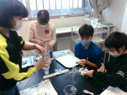 理科の学習では、子供一人一人が課題を選び、実験を行っています。「水に溶けて見えなくなった食塩はどこにいったのだろうか」「物が水にとける量には、限りがあるのだろうか」「水の量や温度を帰ると、物が水に溶ける量はどうなるのだろうか」「水に溶けたものはどうすれば取り出すことができるのだろうか」の4つの問いを解決した子供たちは、実験を通して疑問に思ったことや気になったことをさらに調べています。子供たちは「食塩やミョウバンで行った実験は、他の物質だとどうなるのだろうか」と新たな問いを設定し、片栗粉や砂糖、コーヒーシュガー等から使用するものを選び、実験を行っています。
