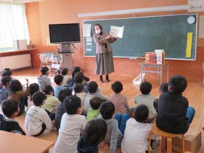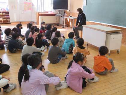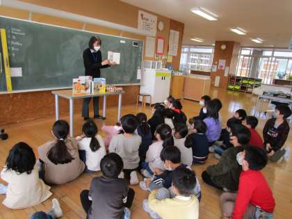 富山市立図書館新庄分館の司書の方から、ストーリーテリングとブックトークをしていただきました。クラスごとに、冒険、変身、数字をテーマにした本を紹介してもらい、子供たちはお話の世界に引き込まれていました。休み時間には、紹介していただいた本を手に取るい子供たちが大勢いました。