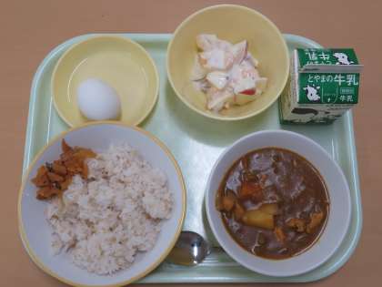 むぎごはん 牛乳 カレーライス ふくしんづけ ゆでたまご