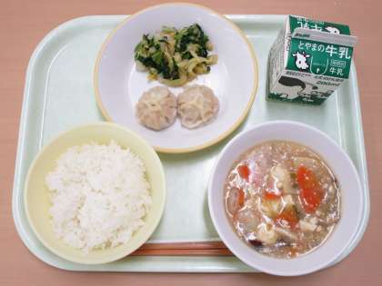 ごはん 牛乳 えびととうふのうまに ショウロンポウ こまつなひたし