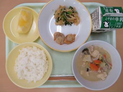 ごはん 牛乳 ごまとうにゅうなべ ほたてのこうみやき はりはりあえ