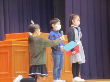 2学期の終業式がありました。校長先生から、2学期から始まった「ひびきあいプロジェクト(挨拶にまつわるエピソードを先生たちが順に話していく取り組み)」についてや、子供たちが地域の人への挨拶が上手になってきたことなどについてお話がありました。ども子も真剣な顔で話を聞いていました。また、児童代表の子供たちが、挨拶や係活動など、2学期がんばったことについて発表しました。3学期も挨拶を大切に、ひびきあいの輪が広がっていくことを願っています。