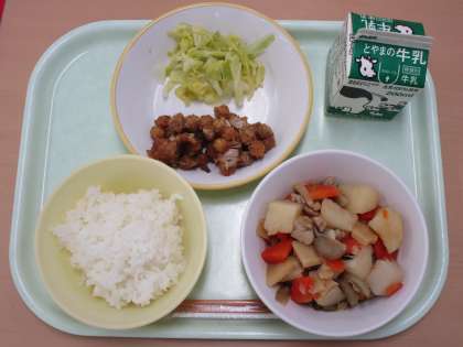ごはん 牛乳 さかなとまめのえごまみそがらめ ゆでキャベツ
