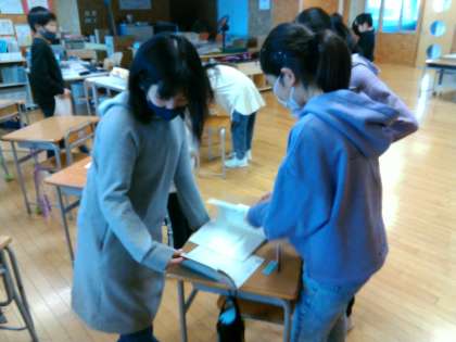 冬休みの課題で取り組んだ自主学習をみんなで見合う「自主学習コンテスト」を開き、いいなと思った友達の自主学習に投票しました。2学期の学習内容をしっかり復習しているものや、授業では学習しない発展的な内容を調べているものなど、様々な取組が見られました。