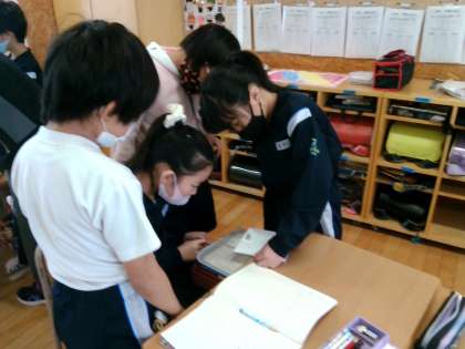 理科の時間の様子です。電気を通すものと通さないものをグループの友達と協力して調べています。