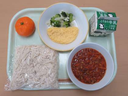 ソフトめん 牛乳 ソフトめんのミートソースかけ オムレツ