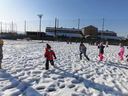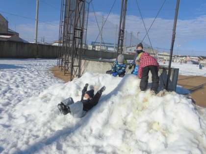 今日は雪遊びをしました。グラウンドの雪は少し減ってしまっていましたが、よいお天気の中で気持ちよく遊ぶことができました。子供たちは、友達と雪合戦をしたり、雪山から滑り降りたりして、思い切り楽しんでいました。