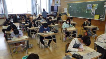 版画の学習が、彫刻刀で版を彫る活動に進みました。初めて使う彫刻刀を慎重に扱い、丁寧に作品を仕上げていきます。