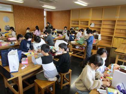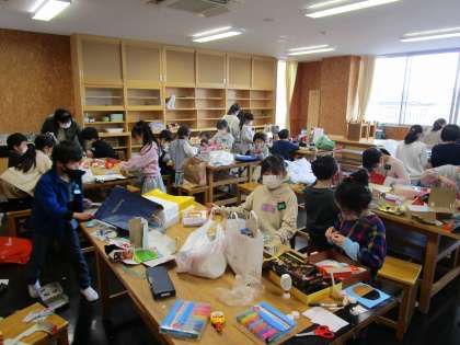 箱や折り紙などの身の回りのものを使って家を作っています。