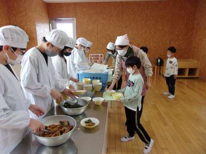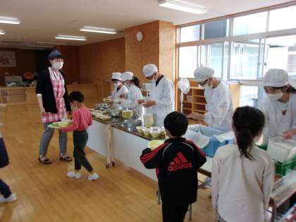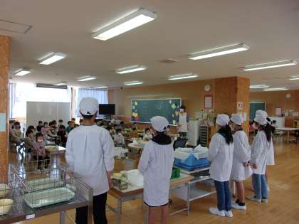 1年生初めての給食の日に、6年生は給食当番のお手本を見せに行きました。代表で準備をしに行った子供たちは、最初はとても緊張した様子でした。しかし、量を調整して盛りつけたり、おぼんにていねいに載せたり、日頃行っていることを1年生の前で示すことができ、終わった後には安心した様子でした。