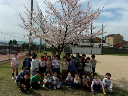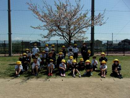 グラウンドの桜の前で記念写真をとりました!