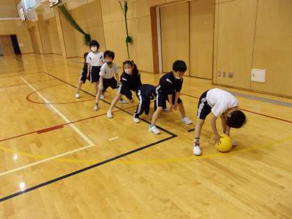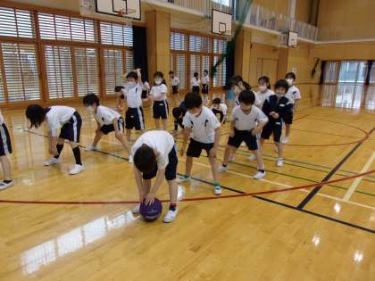 体育では、「体ほぐしの運動」と「鬼ごっこ」をしています。「体ほぐしの運動」では、自分の体がどこまで動くのかを確認しながら動いています。今日は、ボールを使って体を大きく動かしながら、友達と声をかけ合いリレーをしました。「鬼ごっこ」は、力いっぱい走っていました。みんないっぱい汗をかいていました。