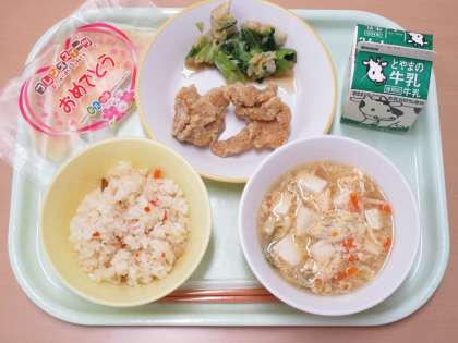 今日の献立は、ちらし寿司 牛乳 鶏肉のから揚げ チンゲンサイひたし かきたま汁 お祝いデザートでした。