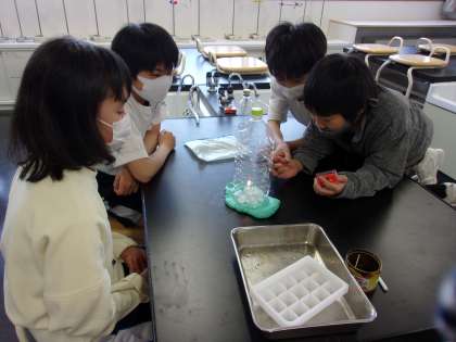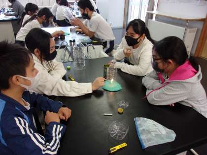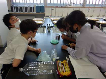 理科の授業では、ペットボトルをかぶせるとロウソクの火が消えたことから、どのようにしたら火が消えなくなるのか、もっと火が燃え続けるのかを子供たちで予想を立て、実験を進めています。