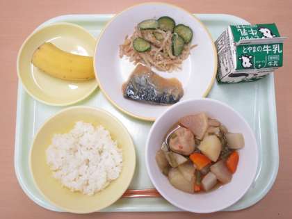 今日の献立は、ごはん 牛乳 さばのみそ煮 ごま酢和え 関東だき バナナ でした。