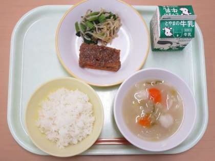 今日の献立は ごはん 牛乳 揚げ出し豆腐のごまだれかけ 昆布和え つみれ汁 でした。
