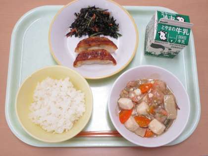 今日の献立は ごはん 牛乳 えびと豆腐のうま煮 焼きぎょうざ ひじきのごま和え でした。