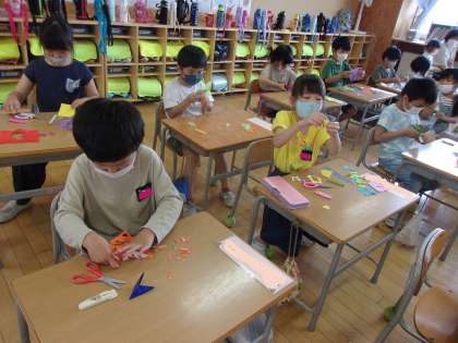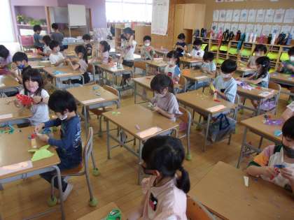 図画工作科の学習では、色紙を折って切り、飾りをつくりました。「おもしろい模様になったよ」「見て!雪の結晶みたい!」と、友達と作品を見せ合いながら取り組んでいました。