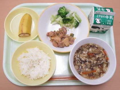 今日の献立は ごはん 牛乳 あっさりチキン そえ野菜 卵ともずくのスープ バナナ でした。