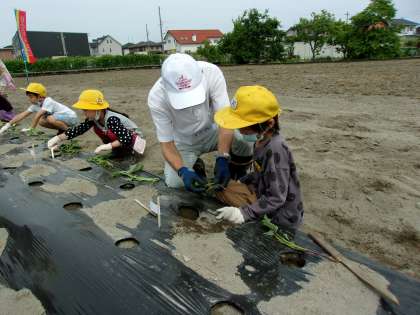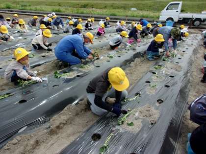 毎年、地域の方の畑を借り、さつまいもの苗植え、そして秋には芋掘りをさせていただいております。今日は2年生みんなで安全に気を付けながら歩いて畑まで行きました。畑には、たくさんの地域の方が待ってくださっており、耕し整備され、マルチのかかった畝が用意されていました。