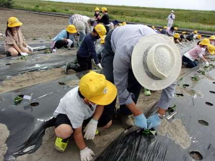 子供たちは地域の方の説明を真剣に聞き、それぞれ苗を植えました。学校へ帰ってからは、畑の用意をしてくださったり、これからのお世話をしてくださる地域の方々への感謝の気持ちをお手紙で表しました。