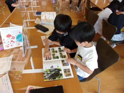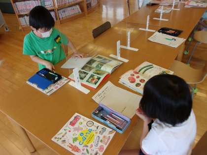生活科で育てている野菜について、図書室で図鑑や絵本を使って調べました。同じ野菜を育てている友達と一緒に調べたり、分かったことを伝え合ったりしました。