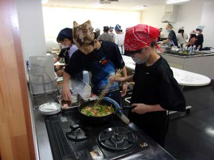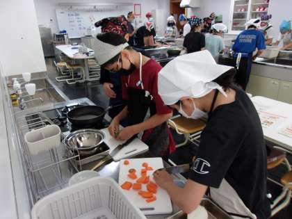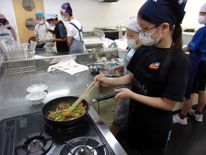 家庭科「朝食から健康な1日の生活を」の学習で、「いろどりいため」をつくりました。学習した炒める調理の手順を確認しながら、手際よく調理していました。