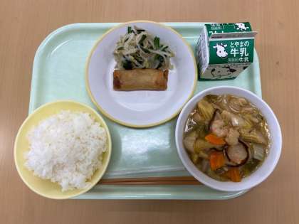 ご飯、牛乳、塩ナムル、春巻き、八宝菜。