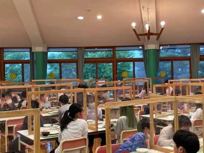 現在、夕食中です。おいしくいただいています。この後、入所式です。
