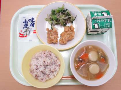 今日の献立は 雑穀入りごはん 牛乳 鶏肉のから揚げ ゆかり和え すいとん 味付け小魚 でした。